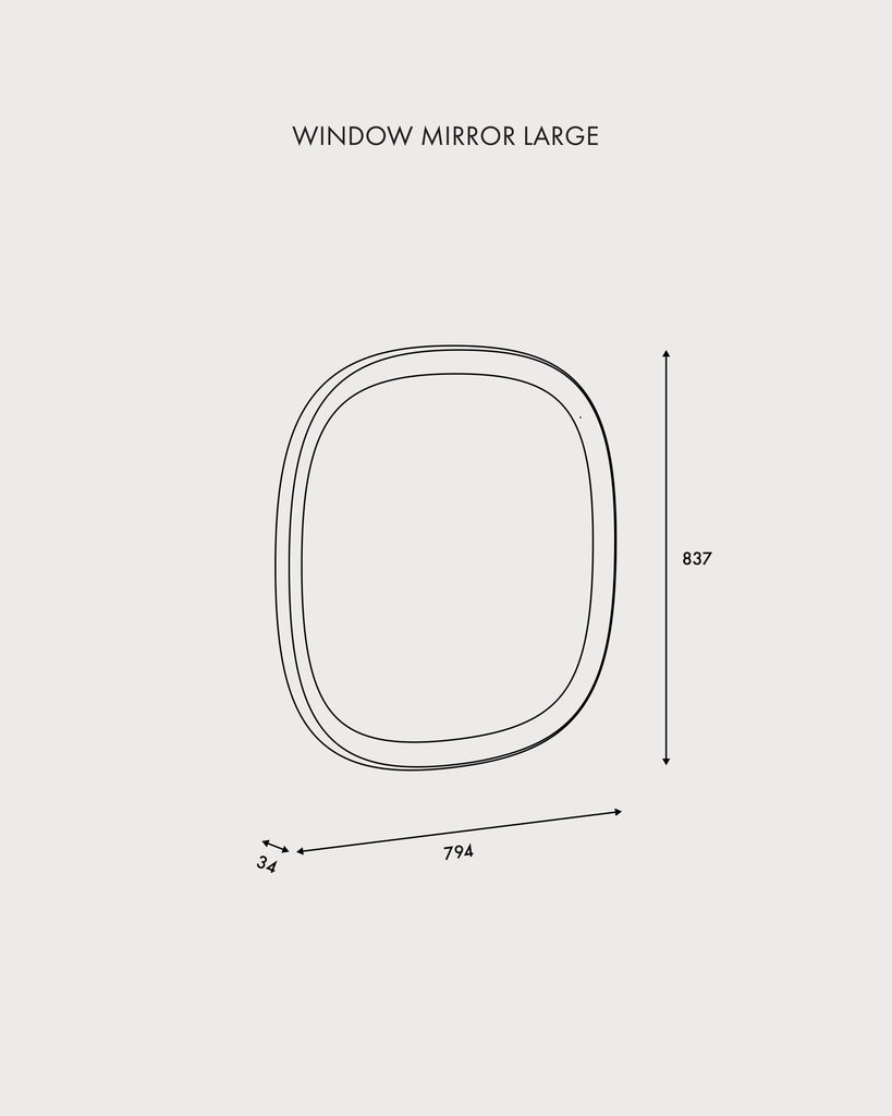 This sculptural mirror is inspired by the form of windows on airplanes and ships, which have pleasant curvatures that allow one to feel relaxed while traveling.The profile of the wooden frame is curved on the outside and chamfered on the inside to integrate with the large chamfer on the glass, creating a beautiful optical effect. Available in two sizes and four different types of wood - ash, smoked ash, oak and walnut. This mirror is meant to evoke good feelings while being indoors, reminiscent of one’s joyous experiences on a journey outdoors.