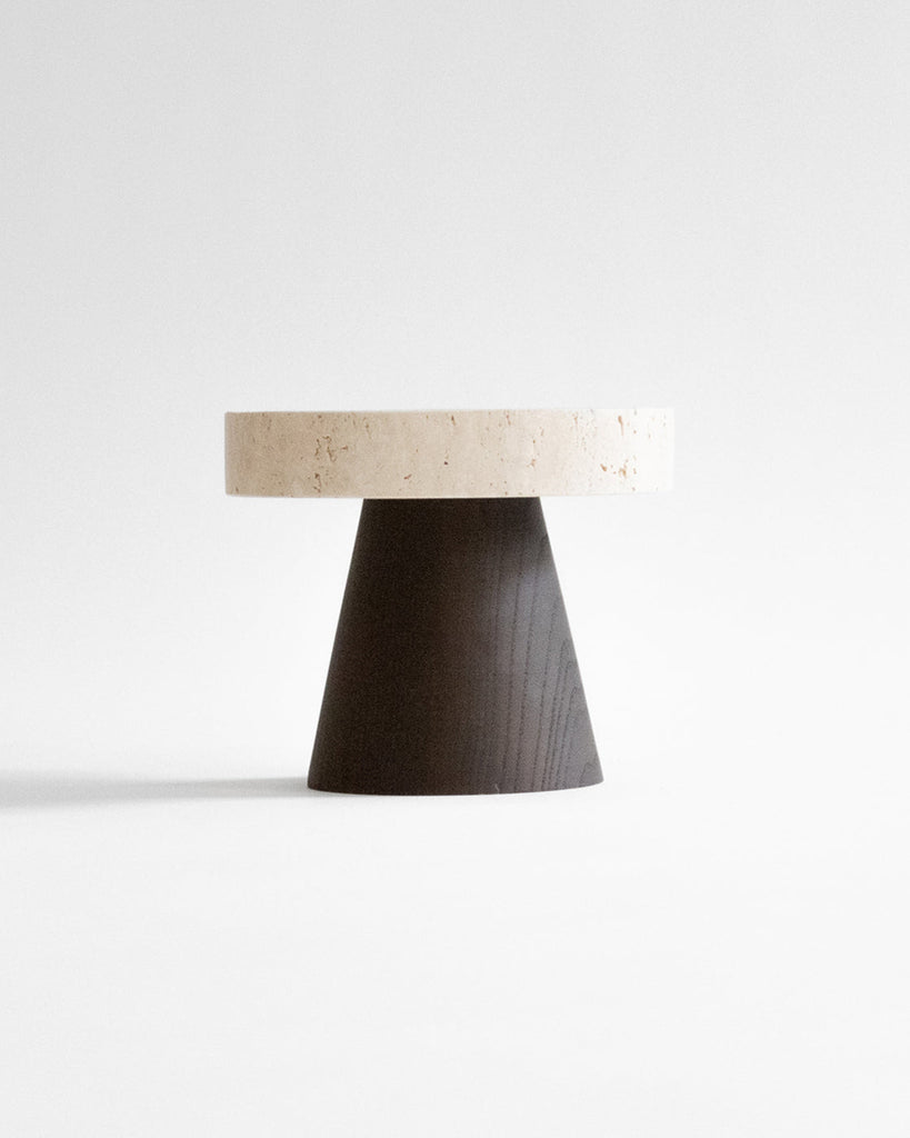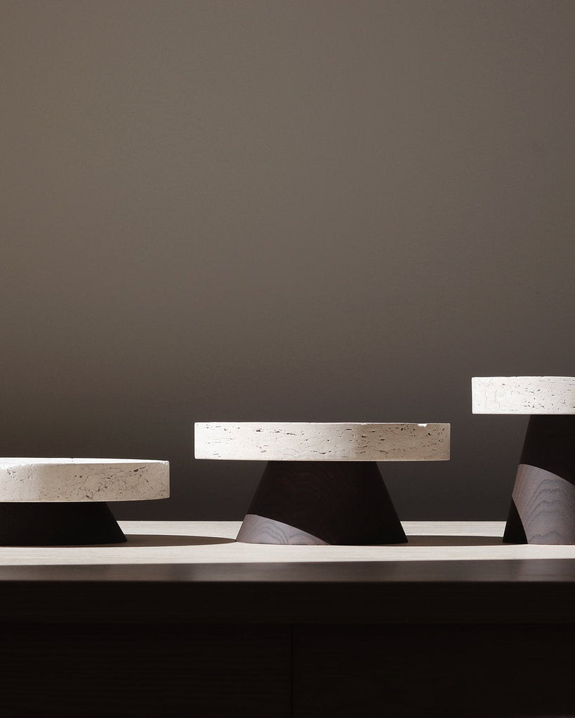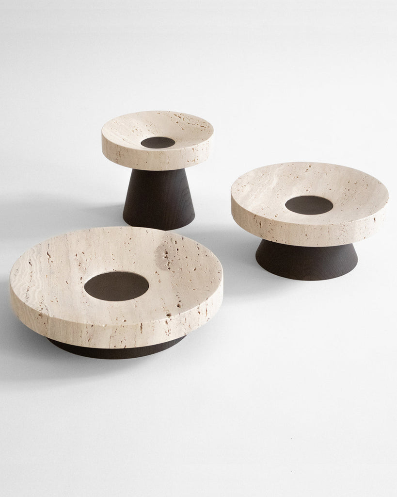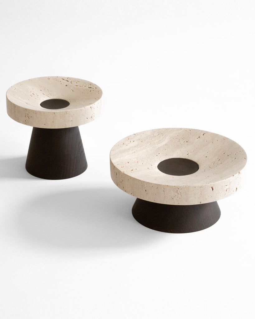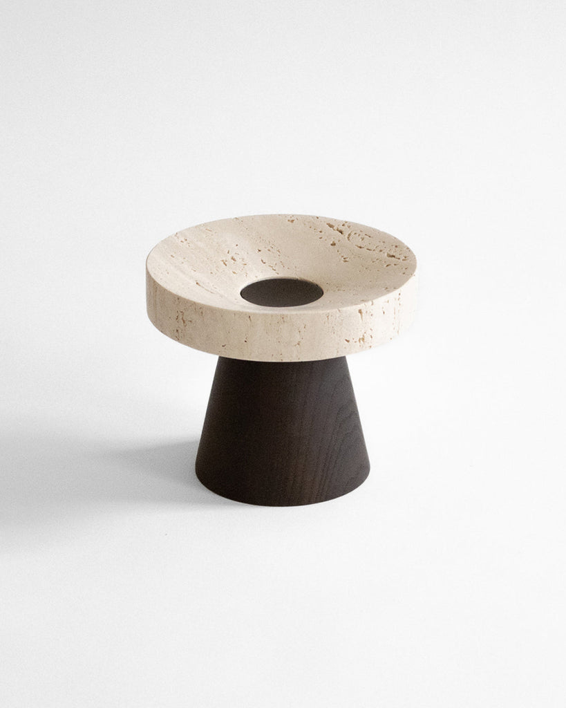 The Coliseu Pedestals designed by Gabriel Tan, with the roman travertine tray made by Ricardo Eira and the smoked ash base made by Carlos Barbosa, are inspired by the amphitheatres of ancient Rome. The gently concave part of the wooden base matches seamlessly with the slope of the travertine tray, resulting in an object that is a functional sculpture combining two noble materials we love. The natural qualities of travertine stone could present certain cavities and color variations.