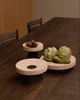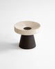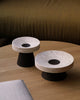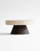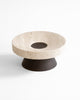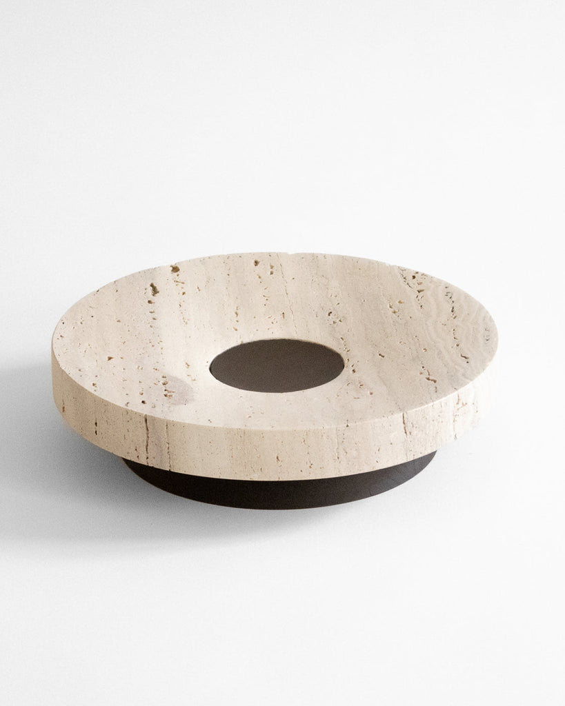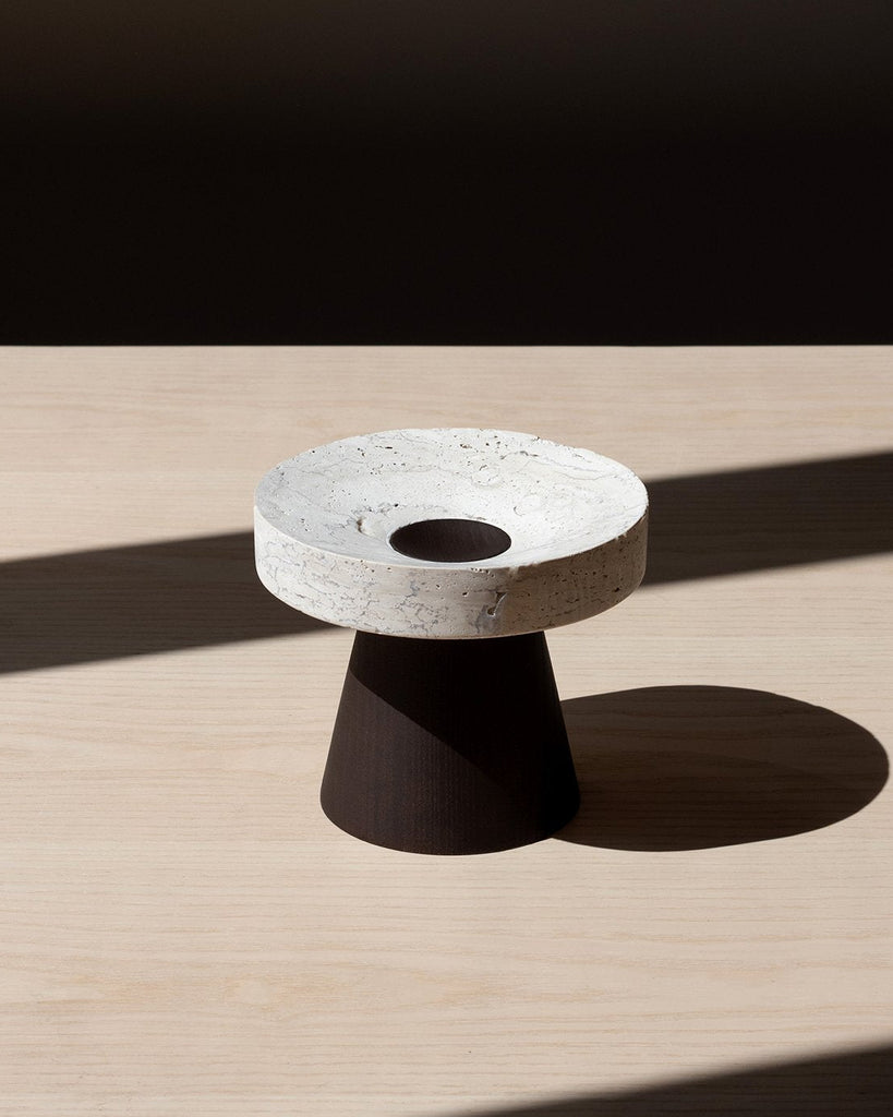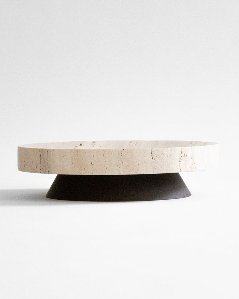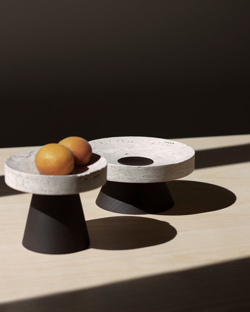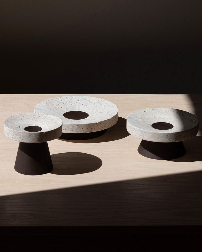 The Coliseu Pedestals designed by Gabriel Tan, with the roman travertine tray made by Ricardo Eira and the smoked ash base made by Carlos Barbosa, are inspired by the amphitheatres of ancient Rome. The gently concave part of the wooden base matches seamlessly with the slope of the travertine tray, resulting in an object that is a functional sculpture combining two noble materials we love. The natural qualities of travertine stone could present certain cavities and color variations.